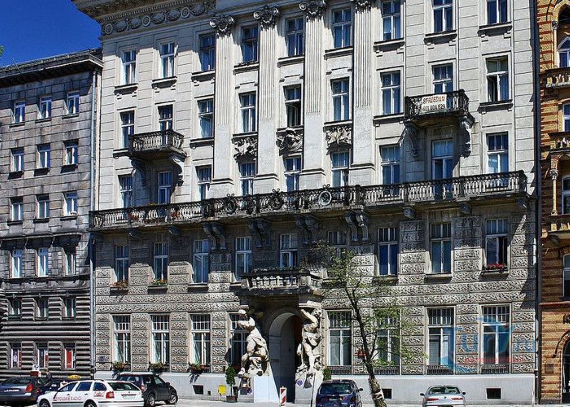 Будівля вирізняється незвичним фасадом, який прикрашають величезні статуї атлантів. Вони роблять кам’яницю монументальною та величною. Проєкт цих статуй створив польський скульптор Зигмунт Отто.